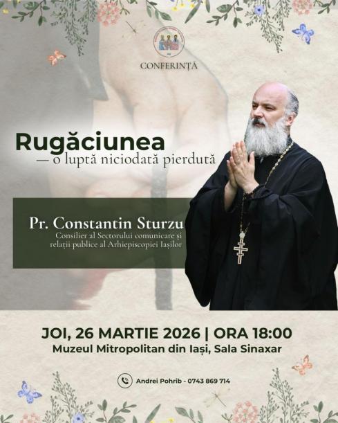 Asociația Prietenii Sfinților Trei Ierarhi organizează conferința „Rugăciunea – o luptă niciodată pierdută”, care va avea loc în intervalul 18:00-20:00, la Muzeul Mitropolitan din Iași, în Sala Sinaxar. Evenimentul constituie cea de-a doua întâlnire dintr-o serie de trei conferințe desfășurate pe parcursul Postului Mare. Invitatul acestei ediții este părintele Constantin Sturzu, purtător de cuvânt și consilier în cadrul Sectorului de comunicare și relații publice al Arhiepiscopiei Iașilor. Conferința se adresează în special tinerilor și tuturor celor care, în această perioadă de post, doresc să aprofundeze tema propusă.